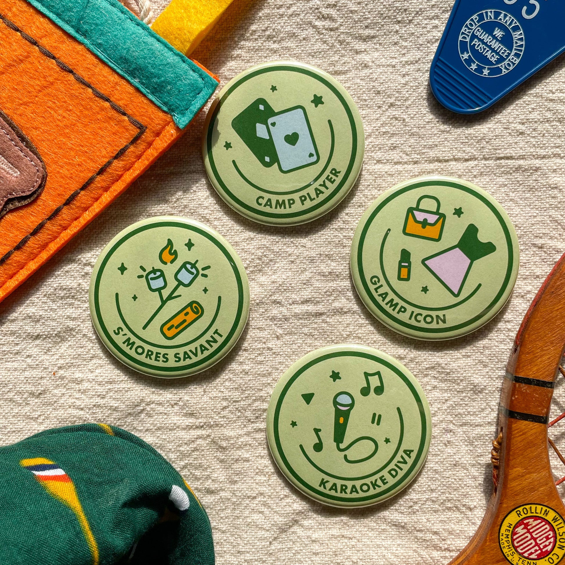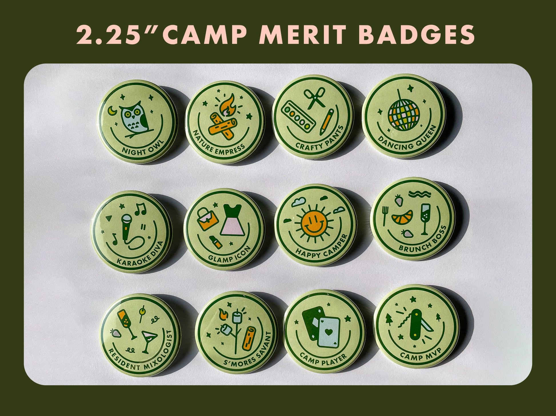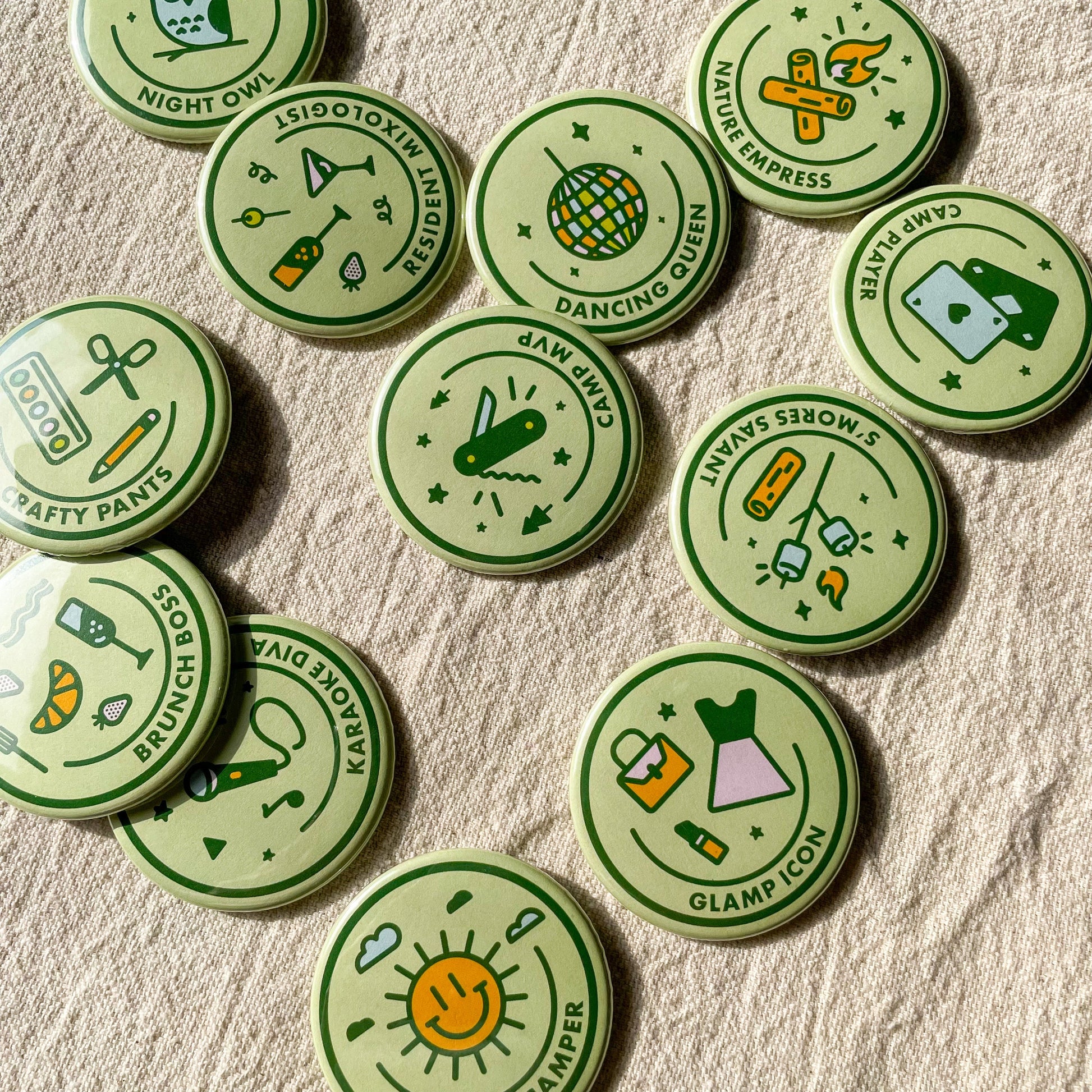 Make your next birthday, family vacation, or camping bachelorette party memorable with these adorable merit badges. Made out of sturdy metal buttons, these pins can be cherished forever and you can easily accessorize and add them to jackets, backpacks, totes, or anything with permeable fabric.
