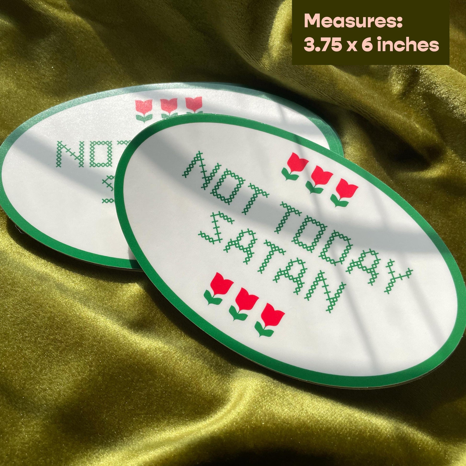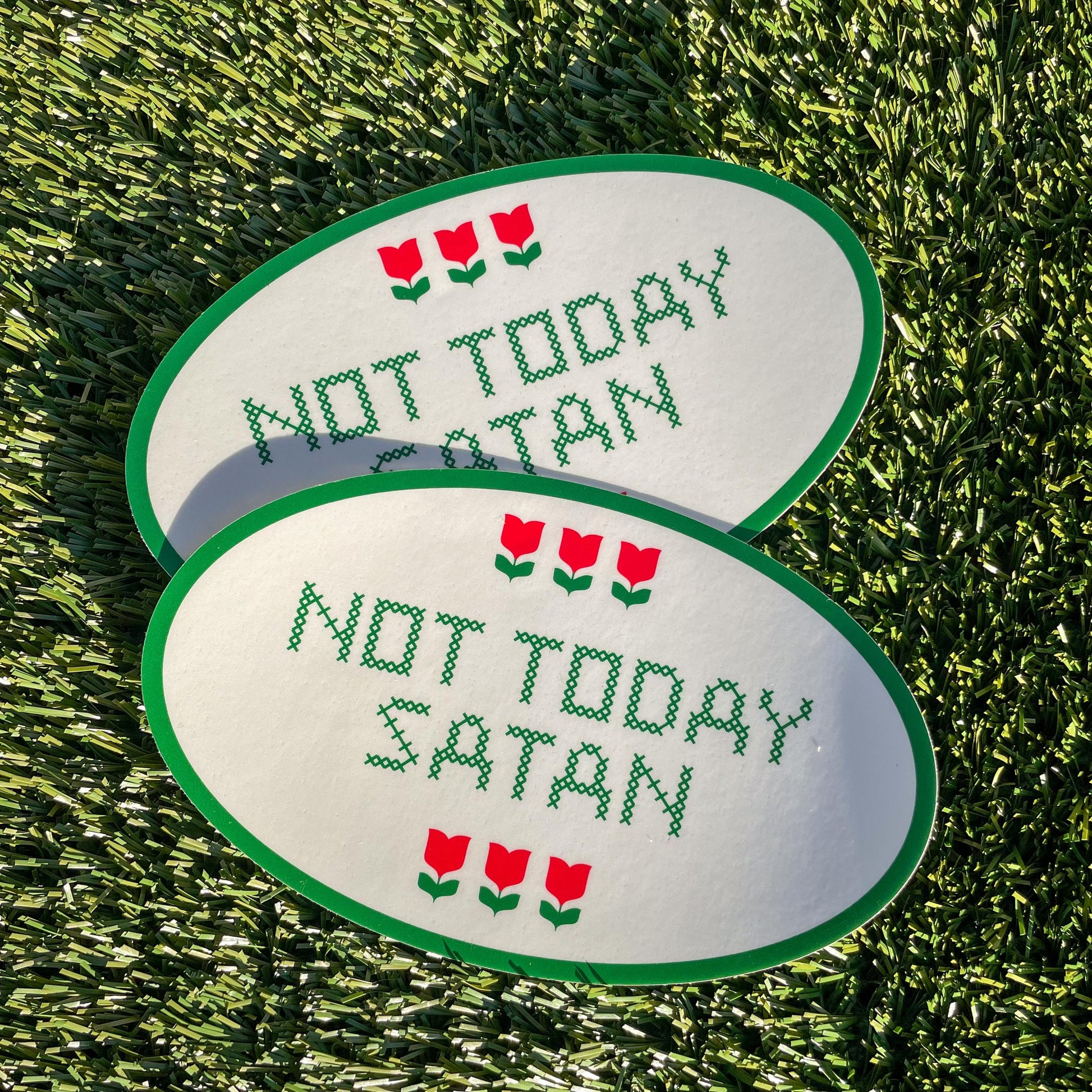 Not Today Satan bumper sticker. A sassy, cross-stitched message to ward off the devilish.