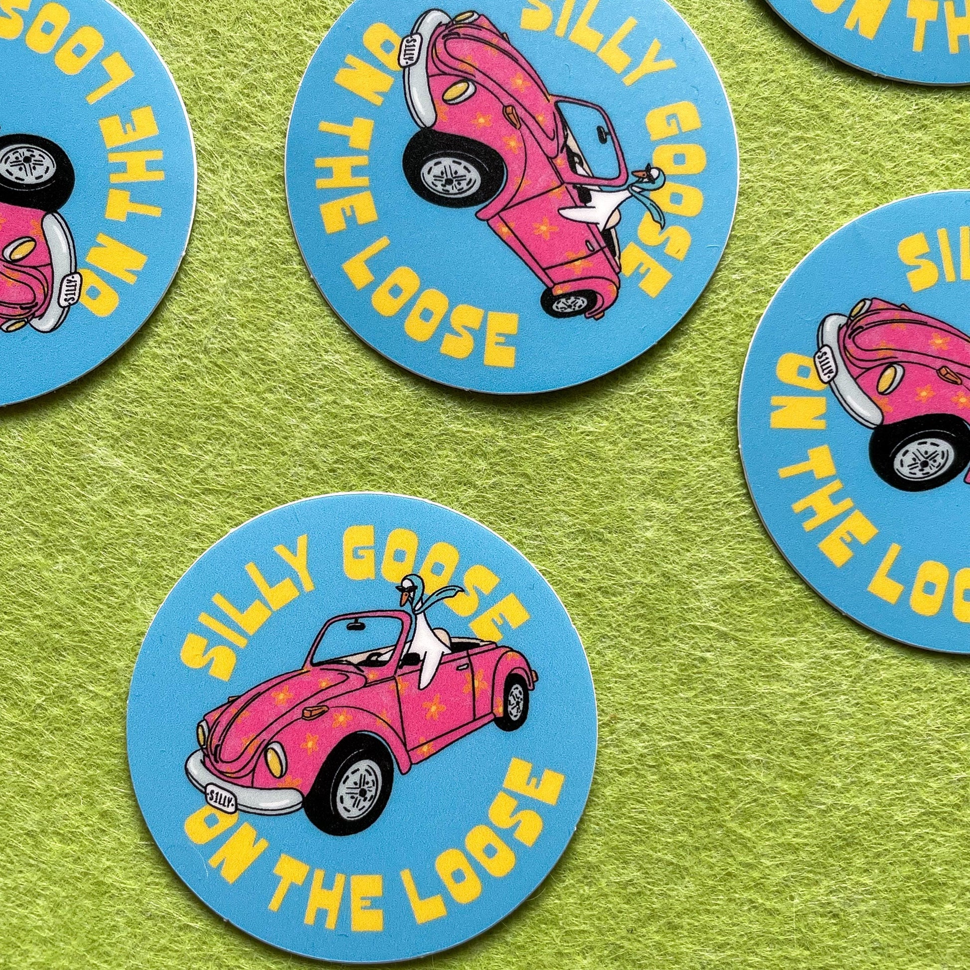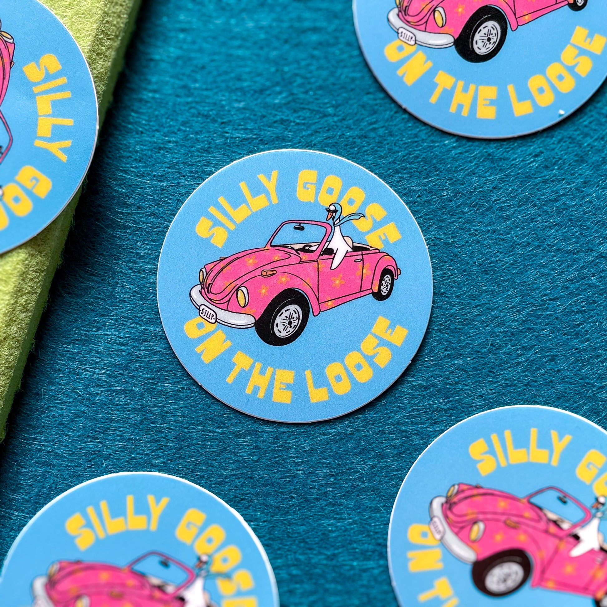 Honk if you love a silly goose! This quirky sticker features a goose in a headscarf, cruising in a pink VW Bug and is the perfect addition to your car, laptop, or water bottle.
